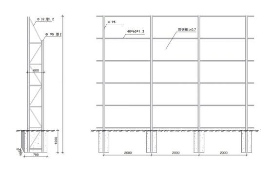 3、技术要求:围挡高度5米,临道路侧铁皮为绿色彩钢瓦(约500米)、其余为蓝色彩钢瓦(约500米),彩钢瓦厚度均为0.7mm;立柱总长度6米,其中地表以上5米,深入基础1米,基础宽度0.7米、长度0.7米,C25混凝土浇筑,立柱材质为φ95毫米镀锌钢管,间距4米;横撑为φ32毫米镀锌钢管;固定用方管尺寸为60毫米X40毫米厚镀锌方管,间隔1米;斜撑为60毫米X40毫米厚镀锌方管,间隔20米;