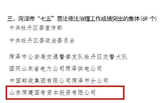 近日,中共菏泽市委全面依法治市委员会办公室、中共菏泽市委宣传部、菏泽市人力资源和社会保障局、菏泽市司法局联合发布了《关于表扬 2016—2020 年菏泽市法治政府建设和“七五”普法依法治理工作成绩突出的集体和个人的通报》,伟德国际1946源于英国荣获“菏泽市‘七五’普法依法治理工作成绩突出的集体”称号。