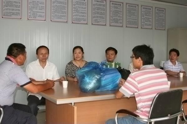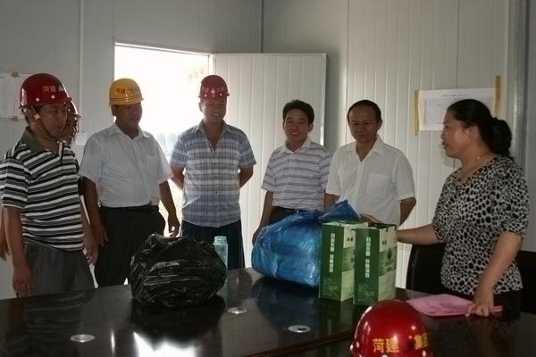 7月11日——7月20日 ,集团工会主席李永亮带领工会及有关部室负责人深入市县及济宁、兖州等40多个施工工地,慰问在炎热天气下坚持施工生产的一线工人,并送去毛巾、香皂、清凉油、花露水、绿豆、茶叶等防暑用品及《夏季常见病防治及安全生产》宣传册。每到一处工地,李主席都详细了解职工的工作及生活情况,并要求各工地:合理安排工作时间,实行高温错时工作,尽量避开高温时段作业,切实做好施工人员的防暑降温工作;认真开展安全生产检查,重点做好防中暑、防触电、防雷击、防食物中毒、防火灾等安全工作,确保职工的人身安全。这次慰问受到了一线的工人的普遍好评。