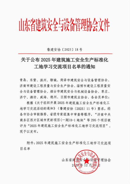 近日,山东省建筑安全与设备管理协会发布《关于公布2025年建筑施工安全生产标准化工地学习交流项目名单的通知》(鲁建安协〔2025〕18号),菏建集团承建的清菏园扩建项目成功入选,荣获“2025年山东省建筑施工安全生产标准化工地学习交流项目”称号。