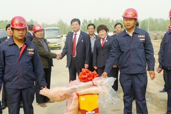 演出之前,总经理李信强等集团领导为奋战在滨河春天工地的施工人员送去了猪肉、酒类等慰问品。