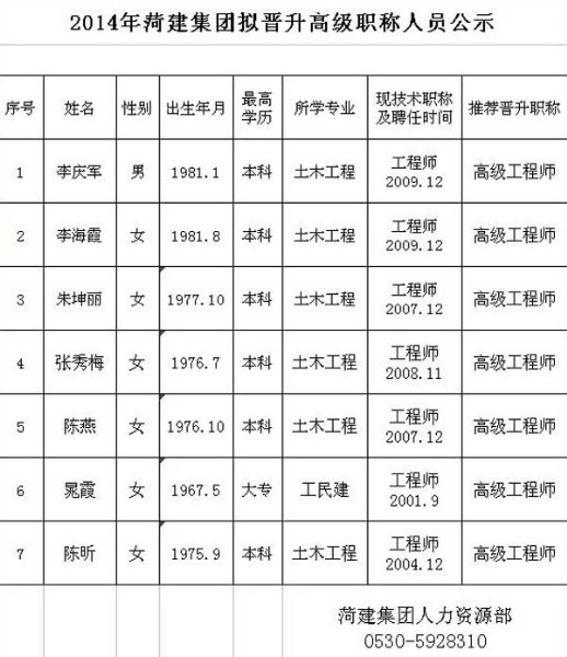 2014年菏建集团拟晋升高级职称人员公示